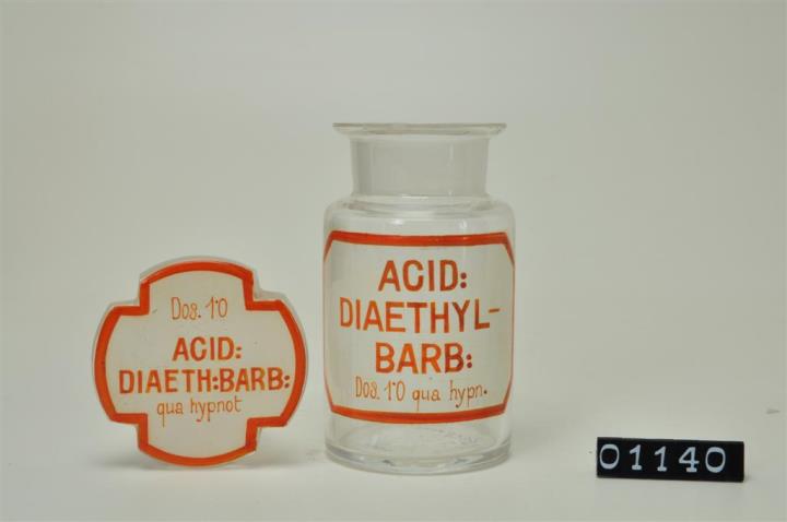 Rundes, farbloses Pulverglas mit signiertem Kreuzstopfen (Massivstopfen). Ausgebogener, abgeflachter Mündungsrand. Achteckiges, weißes Emailleschild mit rotem Rand. Rot signiert.