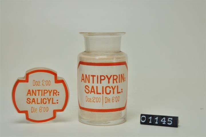 Rundes, farbloses Pulverglas mit signiertem Kreuzstopfen (Massivstopfen). Ausgebogener, abgeflachter Mündungsrand. Achteckiges, weißes Emailleschild mit rotem Rand. Rot signiert.
