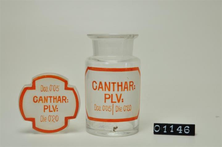 Rundes, farbloses Pulverglas mit signiertem Kreuzstopfen (Massivstopfen). Ausgebogener, abgeflachter Mündungsrand. Achteckiges, weißes Emailleschild mit rotem Rand. Rot signiert.