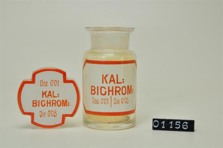 Rundes, farbloses Pulverglas mit signiertem Kreuzstopfen (Massivstopfen). Ausgebogener, abgeflachter Mündungsrand. Achteckiges, weißes Emailleschild mit rotem Rand. Rot signiert.