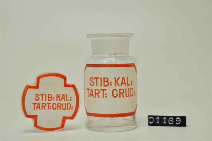 Rundes, farbloses Pulverglas mit signiertem Kreuzstopfen (Massivstopfen). Ausgebogener, abgeflachter Mündungsrand. Achteckiges, weißes Emailleschild mit rotem Rand. Rot signiert.