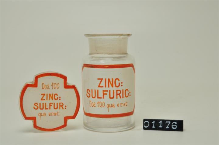 Rundes, farbloses Pulverglas mit signiertem Kreuzstopfen (Massivstopfen). Ausgebogener, abgeflachter Mündungsrand. Achteckiges, weißes Emailleschild mit rotem Rand. Rot signiert.