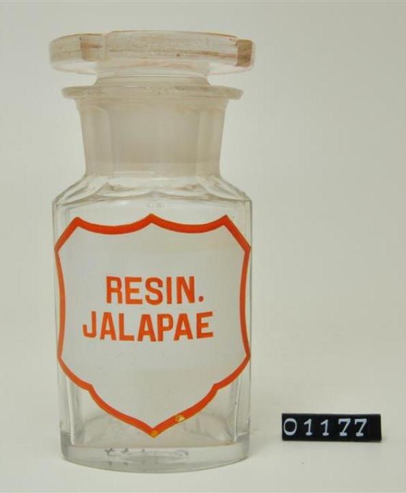 Ovalgriffiges, halb geschliffenes, farbloses Pulverglas mit signiertem Kreuzstopfen (Massivstopfen). Schulter, Hals und Boden geschliffen und poliert. Eingebranntes, weißes Emailleschild mit geschwungenen Umrissen. Rot signiert.