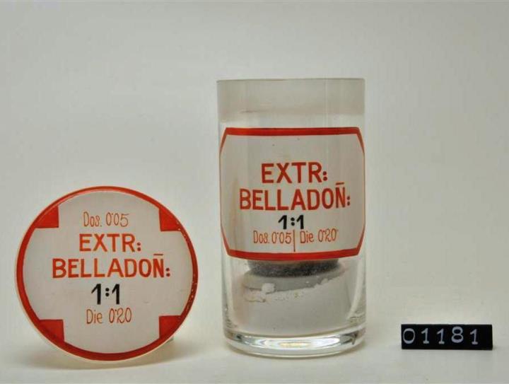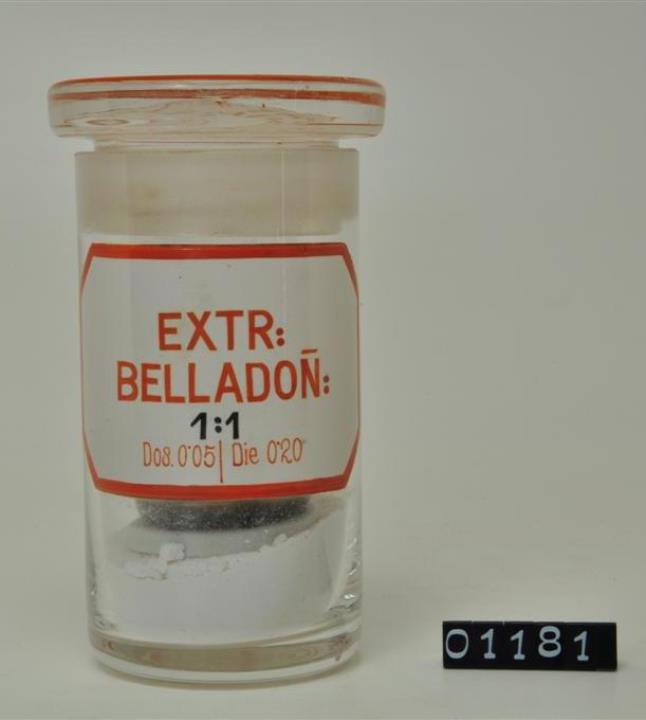 Zylinderförmiges Extraktgefäß aus farblosem Glas, mit signiertem offenem Schliffstopfen und eingebranntem, achteckigen Emailleschild: einfacher roter Rand, rote Schrift mit Maximaldosenangabe. Im Gefäß zylinderförmiges Einsatzglas zur Aufnahme des Extraktes mit eingebrannter, farbloser Emaillelesignatur auf weißem Grund. Das Einsatzglas steht auf einer gelochten Porzellanplatte, darunter eine Schicht ungelöschten Kalkes. Rot signiert.