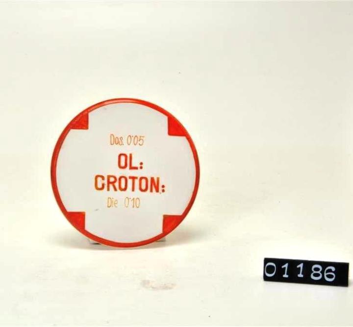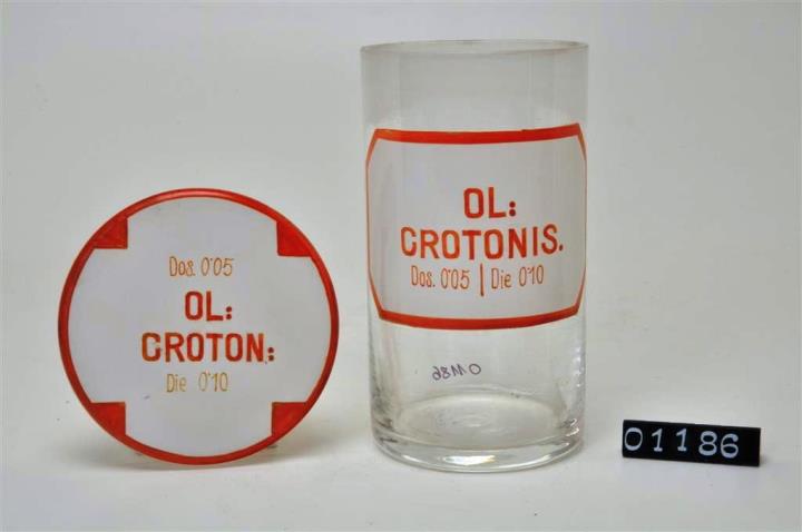 Zylinderförmiges Extraktgefäß aus farblosem Glas, mit signiertem offenem Schliffstopfen und eingebranntem, achteckigen Emailleschild: einfacher roter Rand, rote Schrift mit Maximaldosenangabe. Rot signiert.
