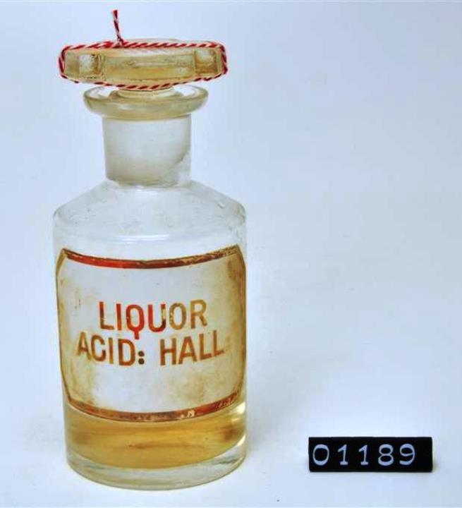Runde, farblose Enghalsflasche mit signiertem Kreuzstopfen (Massivstopfen). Ausgebogener, abgeflachter Mündungsrand. Achteckiges, weißes Emailleschild mit rotem Rand. Rot signiert.