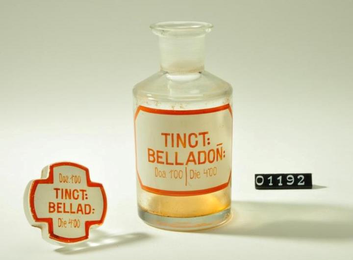 Runde, farblose Enghalsflasche mit signiertem Kreuzstopfen (Massivstopfen). Ausgebogener, abgeflachter Mündungsrand. Achteckiges, weißes Emailleschild mit rotem Rand und Maximaldosenangabe. Rot signiert.
