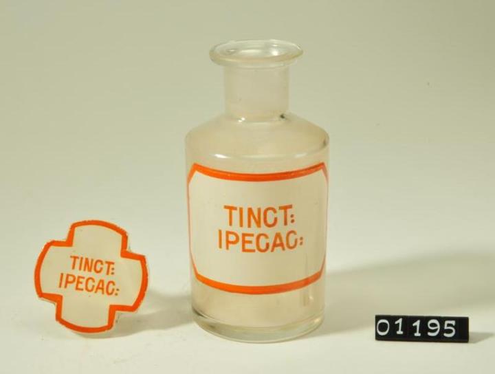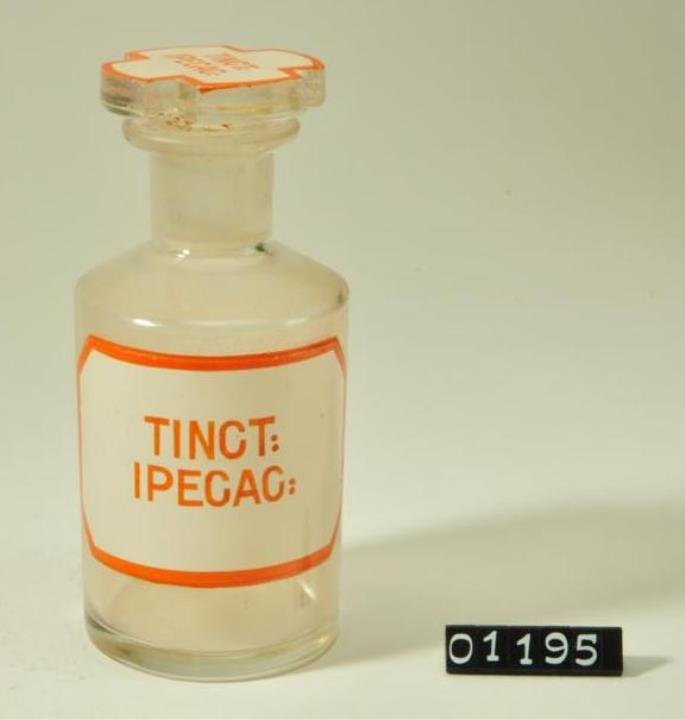 Runde, farblose Enghalsflasche mit signiertem Kreuzstopfen (Massivstopfen). Ausgebogener, abgeflachter Mündungsrand. Achteckiges, weißes Emailleschild mit rotem Rand. Rot signiert.