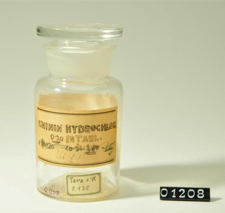 Rundes, farbloses Pulverglas mit Schliffstopfen (Hohlstopfen) mit Hefteisenabriss. Verdickter, abgeflachter Mündungsrand. Mit rot bedrucktem Papierschild signiert.