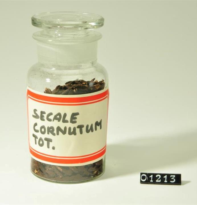 Rundes, farbloses Pulverglas, mundgeblasener Schliffstopfen (Hohlstopfen) mit Hefteisenabriss. Verdickter, abgeflachter Mündungsrand. Rot umrandetes Papierschild von Elisabeth Fehrenbach-Peer schwarz signiert. Enthält ganzes Mutterkorn.