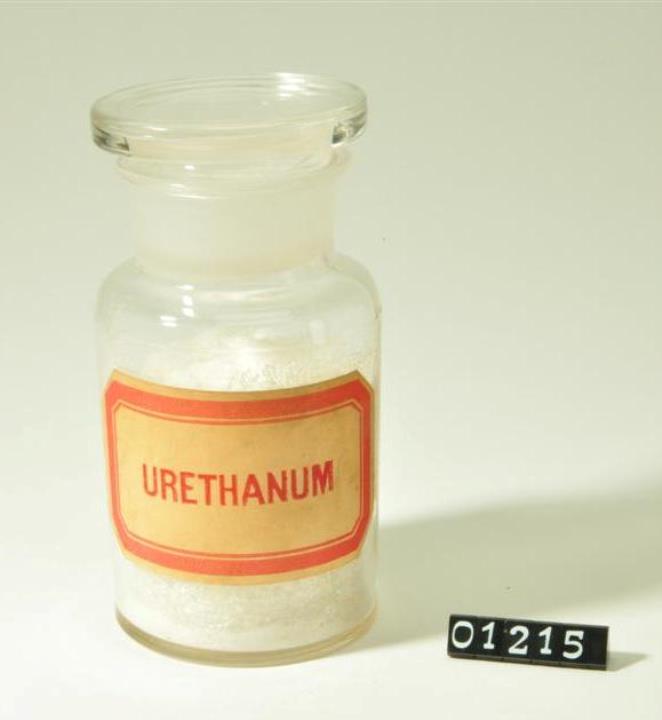 Rundes, farbloses Pulverglas mit mundgeblasenem Schliffstopfen (Hohlstopfen) mit Hefteisenabriss. Verdickter, abgeflachter Mündungsrand. Mit rot bedrucktem Papierschild signiert.