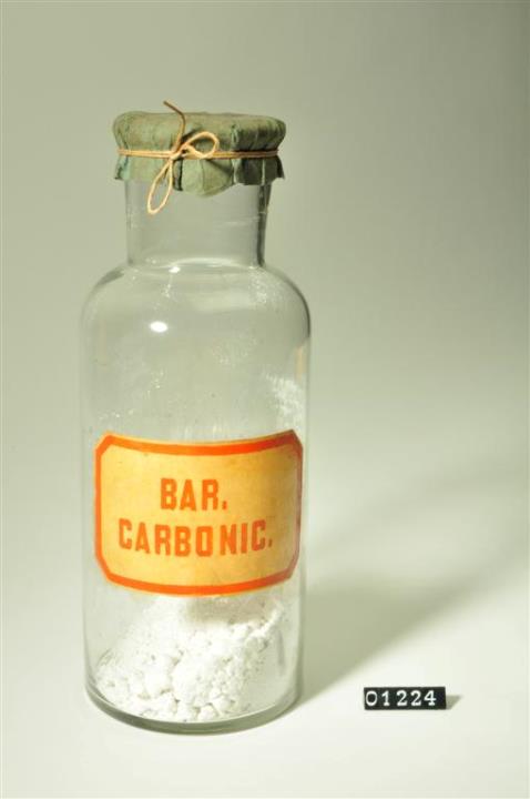 Rundes, farbloses Pulverglas mit Hefteisenabriss. Stopfen mit Tektur, verdickter, Mündungsrand. Mit rot umrandetem und rot bedrucktem Papierschild signiert. Mit Etikettenlack überzogen.