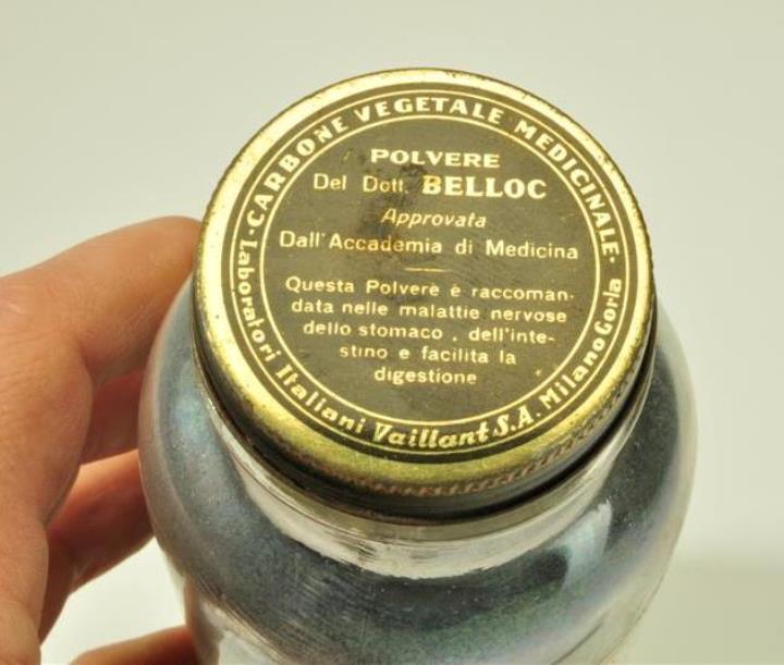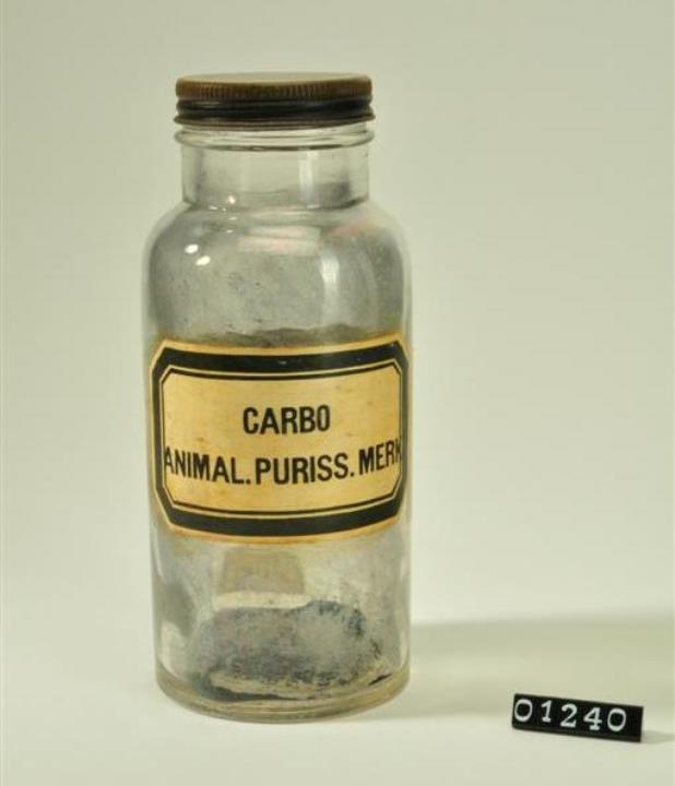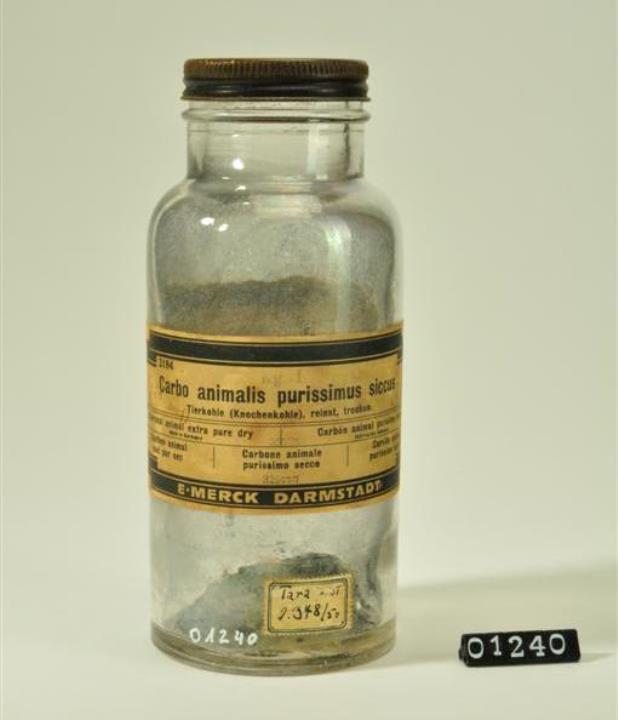 Rundes farbloses Pulverglas mit Schraubverschluss von Carbone Belloc. Schwarz signiert. Rückseite Originaletikett der Firma Merck, sowie rechteckiges, gezähntes, mit Schilderlack überzogenes weißes Etikett mit schwarzem und blauem Rand mit Tara.