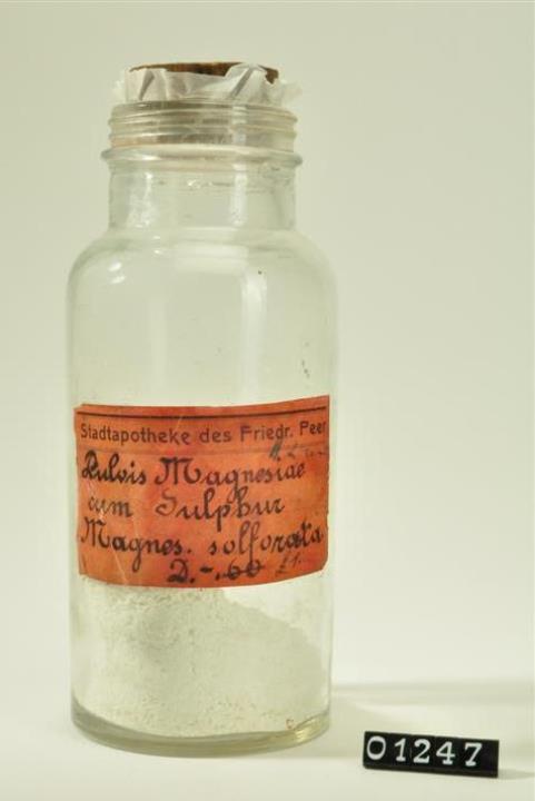 Rundes farbloses Pulverglas mit Schraubgewinde, jedoch ohne Schraubverschluss. Mit Korkstopfen. Seitliche Prägung des Produktnamens (Carbone medicinale del Dott. Belloc). Rotes Etikett der Stadtapotheke Peer, schwarz signiert.