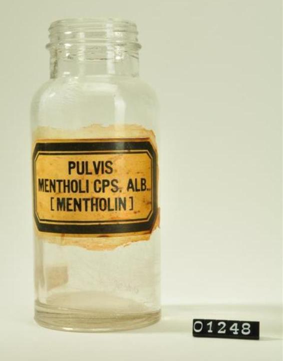 Rundes farbloses Pulverglas mit Schraubgewinde, jedoch ohne Schraubverschluss. Seitliche Prägung des Produktnamens. Mit Signierapparat bedrucktes und mit Schilderlack überzogenes Papierschild, achteckig, mit schwarzem Doppelrand und schwarzer Schrift auf weißem Grund. Rückseite: rechteckiges, gezähntes, mit Schilderlack überzogenes weißes Etikett mit schwarzem und blauem Rand mit Tara.