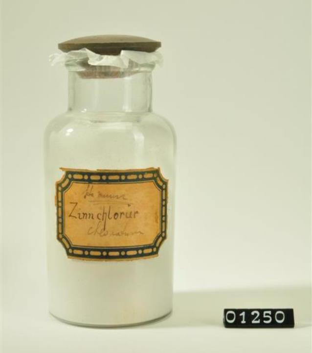 Rundes, farbloses Pulverglas mit Gummi-Korkstopfen. Verdickter Mündungsrand. An den Kanten nach innen gerundetes Schild mit Zierrand. Schwarz signiert. Handschriftlich Stannum chloratum von Ignaz Peer II hinzugeschrieben. Boden leicht eingewölbt mit Volumenprägung und glattem Standring.