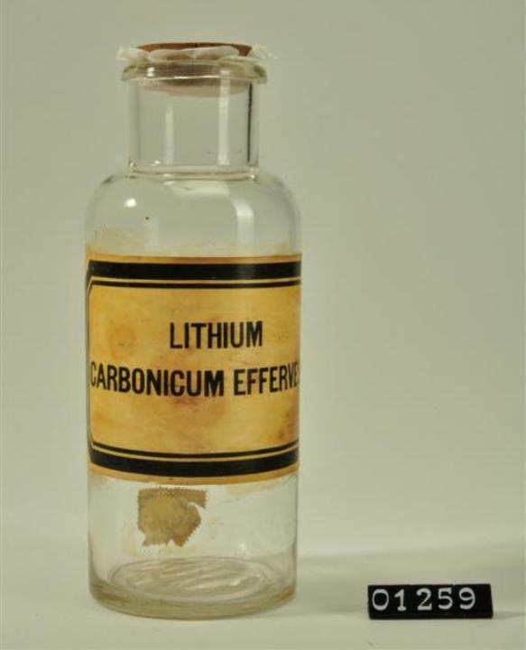Rundes, farbloses Pulverglas mit Korkstopfen. Verdickter Mündungsrand. Mit Signierapparat bedrucktes und mit Schilderlack überzogenes Papierschild, achteckig, mit schwarzem Doppelrand und schwarzer Schrift auf weißem Grund. Rückseite: rechteckiges, gezähntes, mit Schilderlack überzogenes weißes Etikett mit schwarzem und blauem Rand mit Tara.
