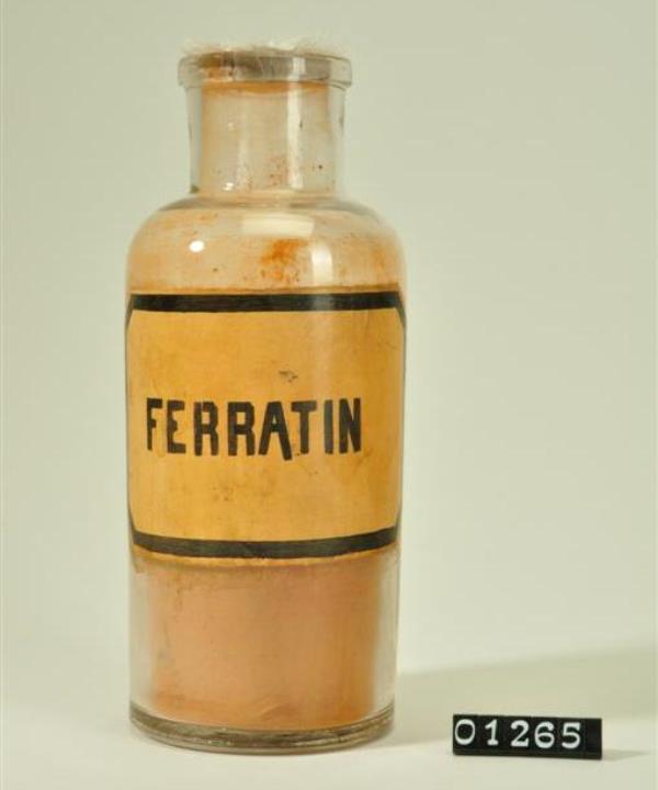 Rundes, farbloses Pulverglas mit Korkstopfen. Verdickter Mündungsrand. Mit Signierapparat bedrucktes und mit Schilderlack überzogenes Papierschild, achteckig, mit schwarzem Doppelrand und schwarzer Schrift auf ehemals weißem Grund. Boden leicht eingewölbt mit Prägung des Volumens.