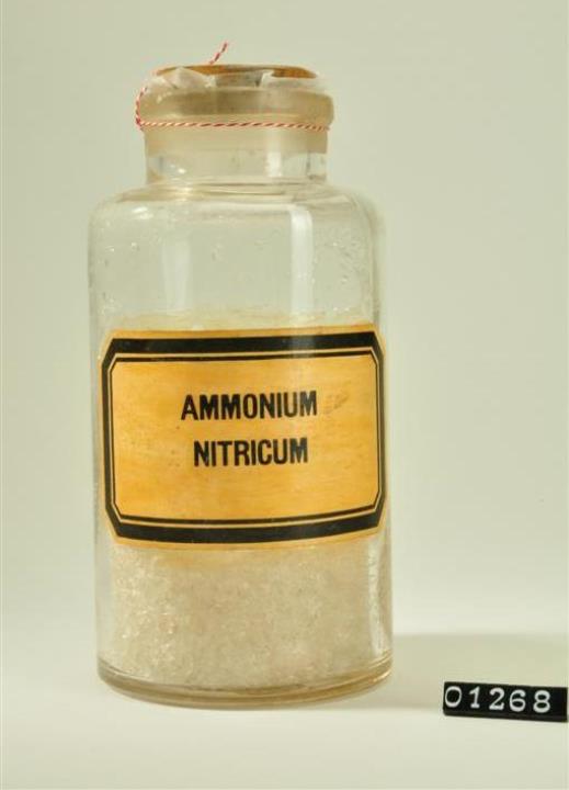 Rundes, farbloses Pulverglas mit Korkstopfen. Verdickter Mündungsrand. Boden leicht eingewölbt mit Prägung des Volumens. Mit Signierapparat bedrucktes und mit Schilderlack überzogenes Papierschild, achteckig, mit schwarzem Doppelrand und schwarzer Schrift auf weißem Grund. Rückseite: rechteckiges, gezähntes, mit Schilderlack überzogenes weißes Etikett mit schwarzem und blauem Rand mit Tara.