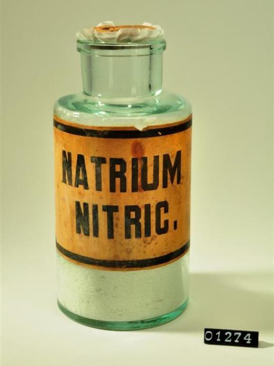 Rundes Pulverglas mit Stopfen aus farblosem Glas mit Grünstich. Flache Schulter, verdickter Mündungsrand. Kork mit Metallring zum leichteren Öffnen. Boden leicht eingewölbt mit Prägung des Volumens. Mit Signierapparat bedrucktes und mit Schilderlack überzogenes Papierschild, achteckig, mit schwarzem Rand und schwarzer Schrift auf ehemals weißem Grund.
