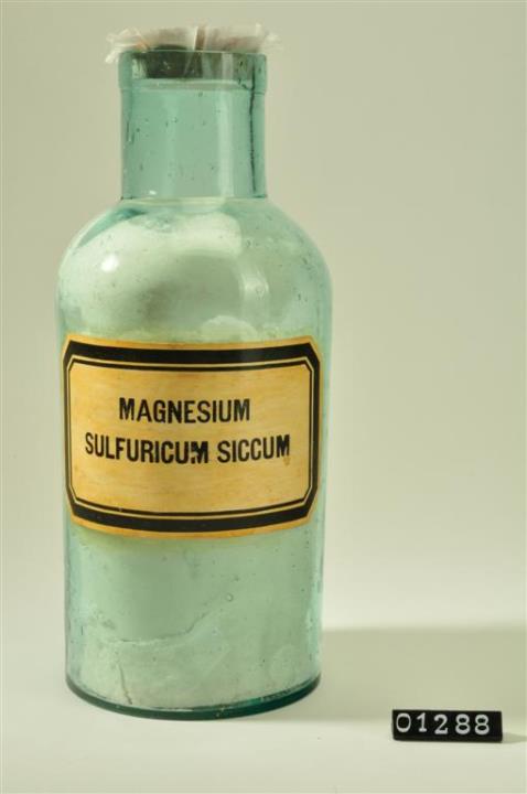 Rundes, grünstichiges Pulverglas, mit Korkstopfen. Verdickter Mündungsrand. Boden glatt, mit Prägung des Volumens. Mit Signierapparat bedrucktes und mit Schilderlack überzogenes Papierschild, achteckig, mit schwarzem Doppelrand und schwarzer Schrift auf ehemals weißem Grund.