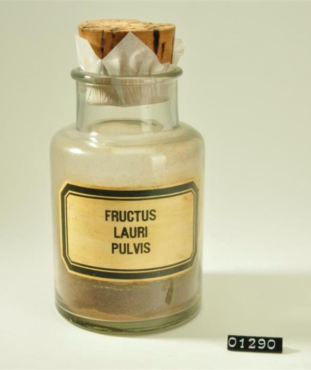 Rundes, farbloses Pulverglas mit Stopfen. Verdickter Mündungsrand. Mit Signierapparat bedrucktes und mit Schilderlack überzogenes Papierschild, achteckig, mit schwarzem Doppelrand und schwarzer Schrift auf weißem Grund. Rückseite: rechteckiges, gezähntes, mit Schilderlack überzogenes weißes Etikett mit schwarzem und blauem Rand mit Tara.