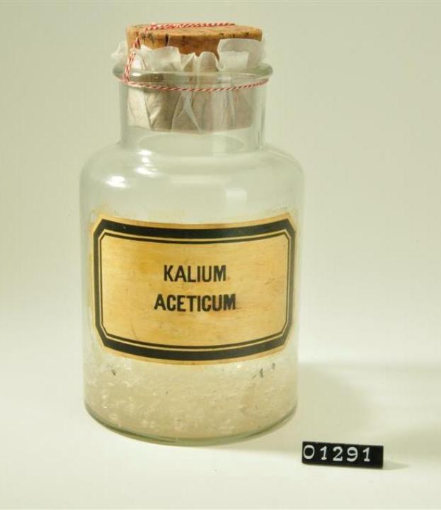 Rundes, farbloses Pulverglas mit Stopfen. Verdickter Mündungsrand. Mit Signierapparat bedrucktes und mit Schilderlack überzogenes Papierschild, achteckig, mit schwarzem Doppelrand und schwarzer Schrift auf weißem Grund. Rückseite: rechteckiges, gezähntes, mit Schilderlack überzogenes weißes Etikett mit schwarzem und blauem Rand mit Tara.