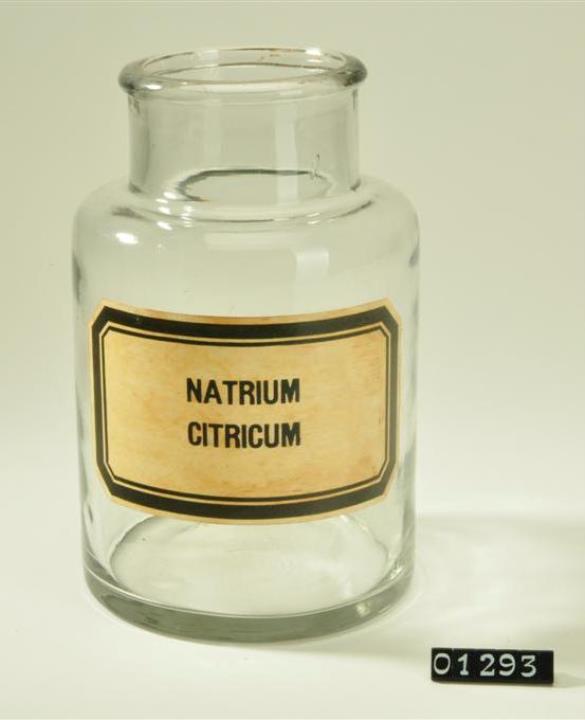 Rundes, farbloses Pulverglas ohne Stopfen. Verdickter Mündungsrand. Mit Signierapparat bedrucktes und mit Schilderlack überzogenes Papierschild, achteckig, mit schwarzem Doppelrand und schwarzer Schrift auf weißem Grund. Rückseite: rechteckiges, gezähntes, mit Schilderlack überzogenes weißes Etikett mit schwarzem und blauem Rand mit Tara.