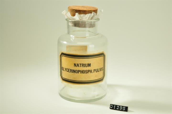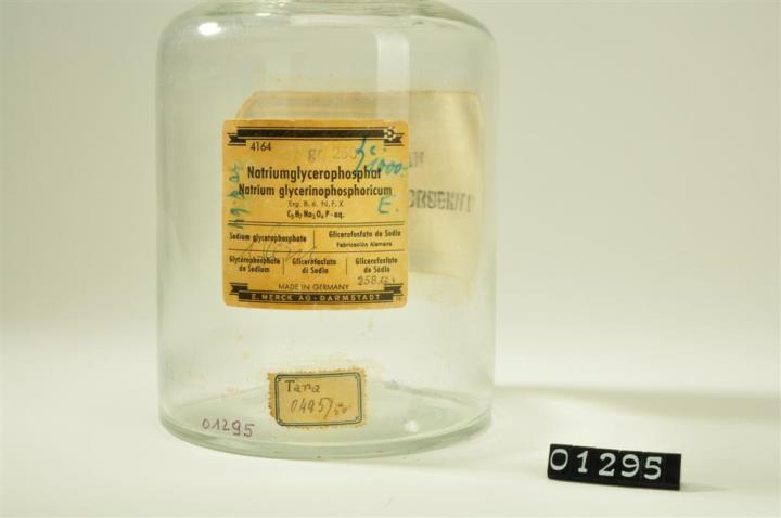 Rundes, farbloses Pulverglas mit Stopfen. Verdickter Mündungsrand. Mit Signierapparat bedrucktes und mit Schilderlack überzogenes Papierschild, achteckig, mit schwarzem Doppelrand und schwarzer Schrift auf weißem Grund. Rückseite: rechteckiges, gezähntes, mit Schilderlack überzogenes weißes Etikett mit schwarzem und blauem Rand mit Tara. Rückseite zusätzlich originales Etikett der Firma Merck mit Einkaufspreis (250g 1.000.- Lire) und Einkaufsdatum (30.09.1964).