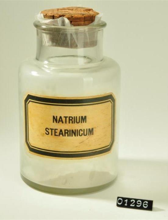 Rundes, farbloses Pulverglas mit Stopfen. Verdickter Mündungsrand. Mit Signierapparat bedrucktes und mit Schilderlack überzogenes Papierschild, achteckig, mit schwarzem Doppelrand und schwarzer Schrift auf weißem Grund. Rückseite: rechteckiges, gezähntes, mit Schilderlack überzogenes weißes Etikett mit schwarzem und blauem Rand mit Tara.