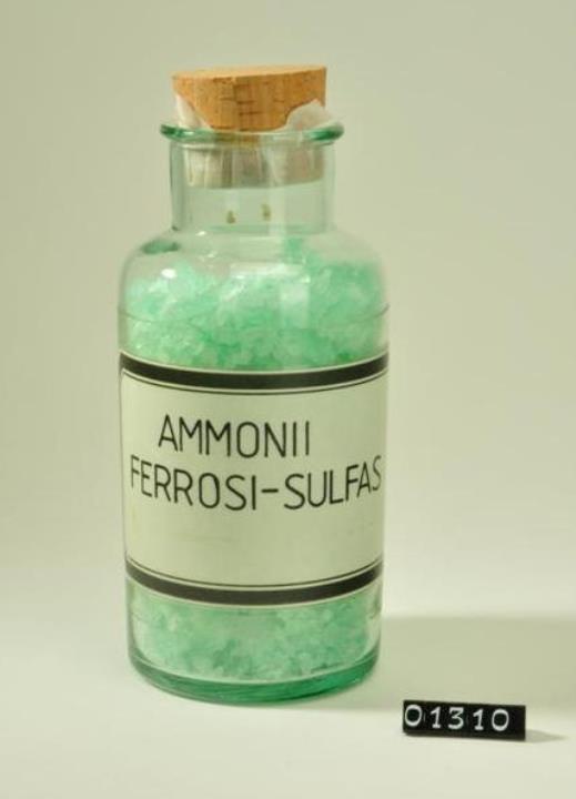 Rundes Pulverglas mit Stopfen aus hellgrünem Glas. Verdickter Mündungsrand. Mit Schablone beschriebenes und mit Folie überzogenes Papierschild, achteckig, mit schwarzem Doppelrand und schwarzer Schrift auf weißem Grund. Rückseite: Tara mit weißem Filzstift geschrieben.