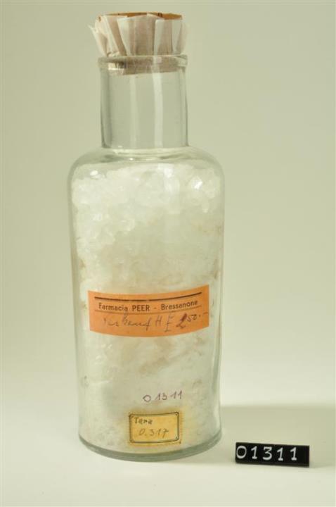 Rundes, farbloses Pulverglas mit Stopfen. Verdickter Mündungsrand. Mit Signierapparat bedrucktes und mit Schilderlack überzogenes Papierschild, achteckig, mit schwarzem Doppelrand und schwarzer Schrift auf ehemals weißem Grund. Rückseite: rechteckiges, gezähntes, mit Schilderlack überzogenes weißes Etikett mit schwarzem und blauem Rand mit Tara. Rotes Etikett mit Verkaufspreis, geschriben von Ignaz Peer II.