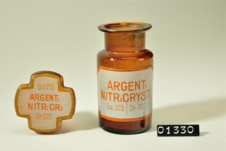 Rundes, braunes Pulverglas mit signiertem Kreuzstopfen (Massivstopfen). Ausgebogener, abgeflachter Mündungsrand. Achteckiges, weißes Emailleschild mit rotem Rand und Maximaldosenangabe. Rot signiert. Im Dezember 1991 aus dem Sortiment genommen (grünes Schild).
