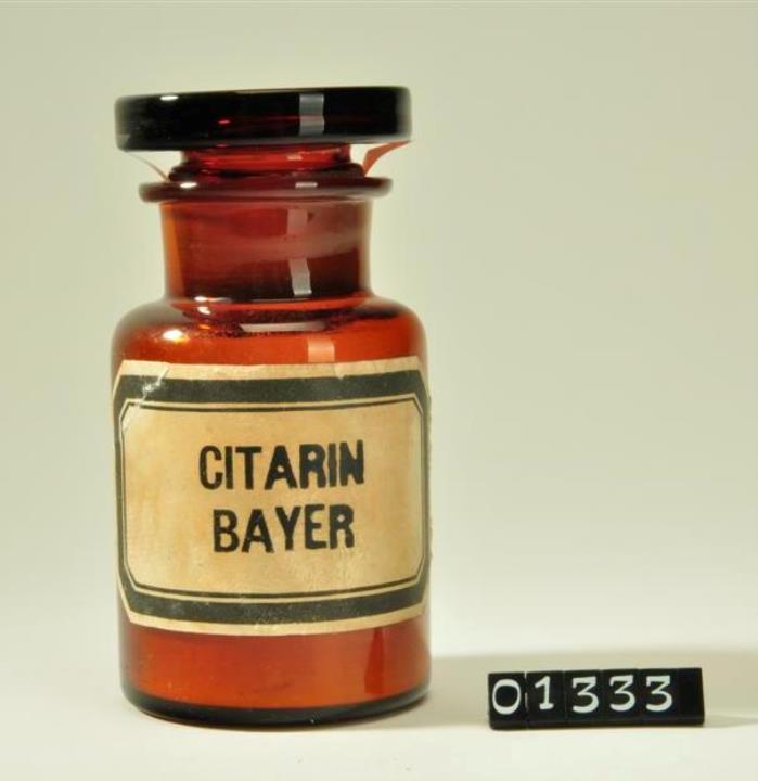 Rundes, braunes Pulverglas mit Schliffstopfen (Hohlstopfen). Ausgebogener, abgeflachter Mündungsrand. Mit Signierapparat bedrucktes und mit Schilderlack überzogenes Papierschild, achteckig, mit schwarzem Doppelrand und schwarzer Schrift auf ehemals weißem Grund.