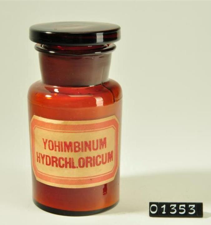Rundes, braunes Pulverglas mit Schliffstopfen (Hohlstopfen). Verdickter, abgeflachter Mündungsrand. Mit Signierapparat bedrucktes und mit Schilderlack überzogenes Papierschild, achteckig, mit rotem Doppelrand und roter Schrift auf ehemals weißem Grund.