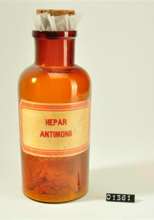 Rundes, braunes Pulverglas mit Stopfen. Verdickter, abgeflachter Mündungsrand. Mit Signierapparat bedrucktes und mit Schilderlack überzogenes Papierschild, achteckig, mit rotem Doppelrand und roter Schrift auf ehemals weißem Grund.
