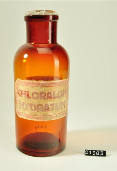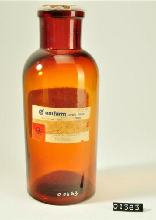 Rundes, braunes Pulverglas mit Stopfen. Verdickter, abgeflachter Mündungsrand. Mit Signierapparat bedrucktes und mit Schilderlack überzogenes Papierschild, achteckig, mit rotem Doppelrand und roter Schrift auf ehemals weißem Grund.