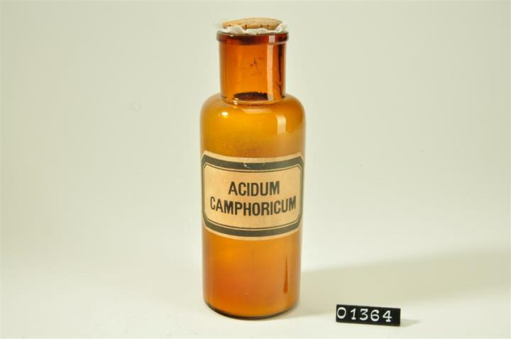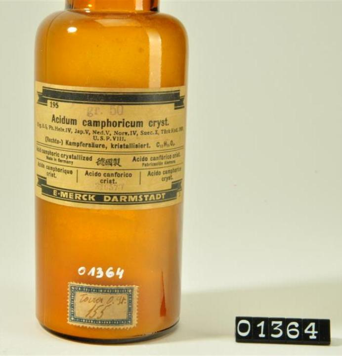Rundes, braunes Pulverglas mit Stopfen. Verdickter, abgeflachter Mündungsrand. Mit Signierapparat bedrucktes und mit Schilderlack überzogenes Papierschild, achteckig, mit schwarzem Doppelrand und schwarzer Schrift auf ehemals weißem Grund.