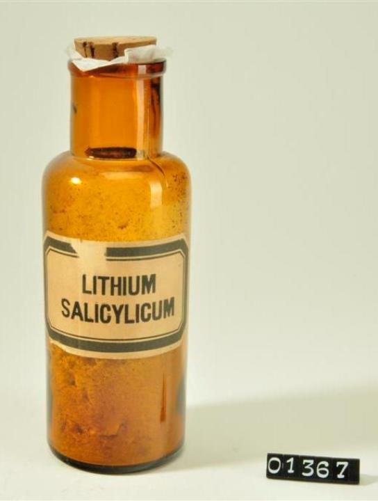 Rundes, braunes Pulverglas mit Stopfen. Verdickter, abgeflachter Mündungsrand. Mit Signierapparat bedrucktes und mit Schilderlack überzogenes Papierschild, achteckig, mit schwarzem Doppelrand und schwarzer Schrift auf ehemals weißem Grund.