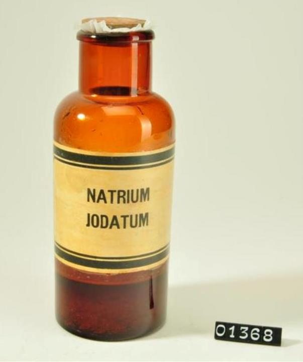 Rundes, braunes Pulverglas mit Stopfen. Verdickter, gerundeter Mündungsrand. Mit Signierapparat bedrucktes und mit Schilderlack überzogenes Papierschild, achteckig, mit schwarzem Doppelrand und schwarzer Schrift auf ehemals weißem Grund. Enthält Jodnatrium