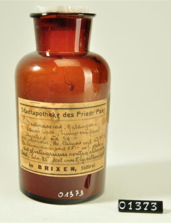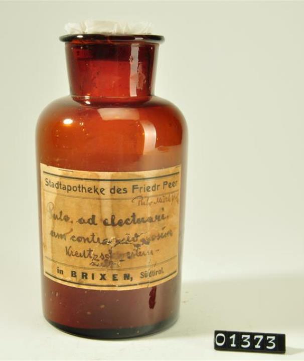 Rundes, braunes Pulverglas mit Stopfen. Verdickter, abgeflachter Mündungsrand. Handschriftlich mit schwarzer Tinte auf einem Etikett der Stadtapotheke Peer signiert.