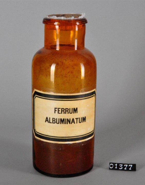 Rundes, braunes Pulverglas mit Stopfen. Mündungsrand mit umgelegtem Faden. Mit Signierapparat bedrucktes und mit Schilderlack überzogenes Papierschild, achteckig, mit schwarzem Doppelrand und schwarzer Schrift auf ehemals weißem Grund. Bodenprägung: "600". Mit Inhalt.