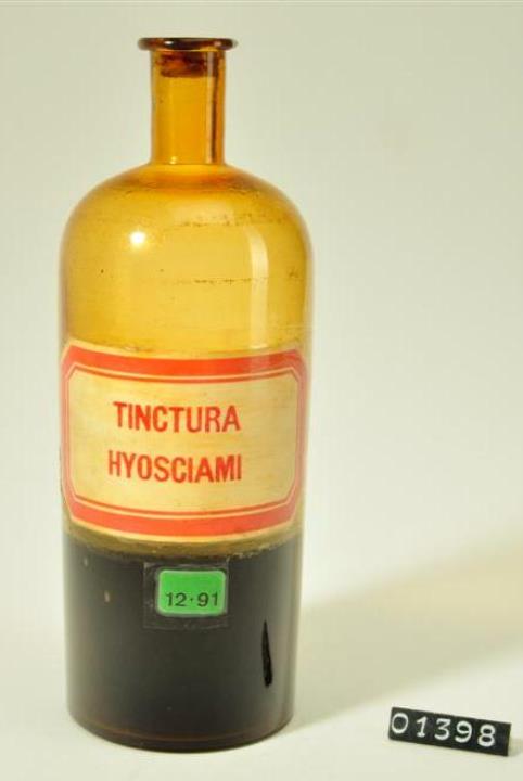 Runde, braune Enghalsflasche mit Stopfen. Flacher, ausladender Mündungsrand. Mit Signierapparat bedrucktes und mit Schilderlack überzogenes Papierschild, achteckig, mit rotem Doppelrand und roter Schrift auf ehemals weißem Grund.