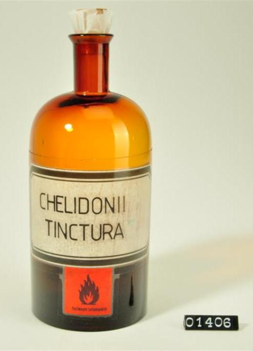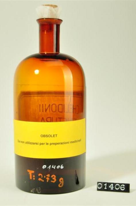 Runde, braune Enghalsflasche mit Stopfen. Ausladender Mündungsrand. Mit Schablone beschriftetes und mit Klarsichtfolie überzogenes Papierschild, achteckig, mit schwarzem Doppelrand und schwarzer Schrift auf ehemals weißem Grund. Rotes Schild mit schwarzem Flammensymbol als Warnhinweis.