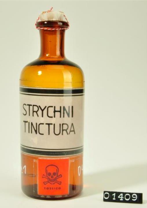 Runde, braune Enghalsflasche mit, weiß-rotem Rezepturfaden gesichertem, Stopfen. Gerundeter, verstärkter Mündungsrand. Mit Schablone beschriftetes und mit Klarsichtfolie überzogenes Papierschild, achteckig, mit schwarzem Doppelrand und schwarzer Schrift auf ehemals weißem Grund. Darunter rotes Warnschild mit schwarz aufgedrucktem Totenkopf.