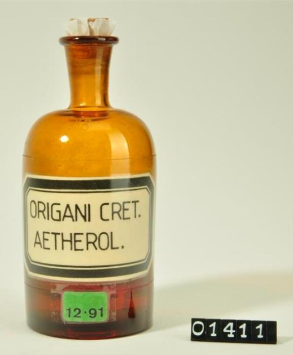Runde, braune Enghalsflasche mit Stopfen. Flacher, ausladender Mündungsrand. Mit Schablone beschriftetes und mit Klarsichtfolie überzogenes Papierschild, achteckig, mit schwarzem Doppelrand und schwarzer Schrift auf ehemals weißem Grund. Im Dezember 1991 aus dem Sortiment genommen (grünes Schild).