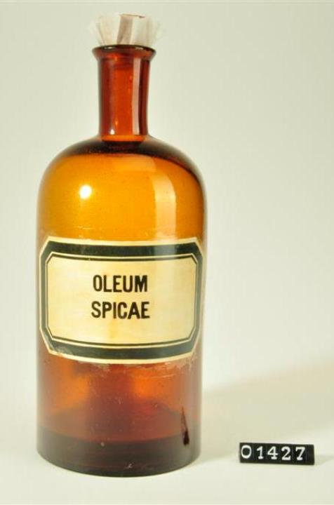 Runde, braune Enghalsflasche mit Stopfen. Ausladender Mündungsrand. Mit Signierapparat bedrucktes und mit Etikettenlack überzogenes Papierschild, achteckig, mit schwarzem Doppelrand und schwarzer Schrift auf ehemals weißem Grund.