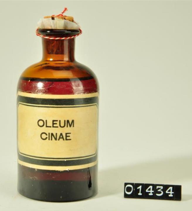 Runde, braune Enghalsflasche mit rot-weißem Rezepturfaden gesichertem Stopfen. Ausladender Mündungsrand. Mit Signierapparat bedrucktes und mit Etikettenlack überzogenes Papierschild, achteckig, mit schwarzem Doppelrand und schwarzer Schrift auf ehemals weißem Grund.