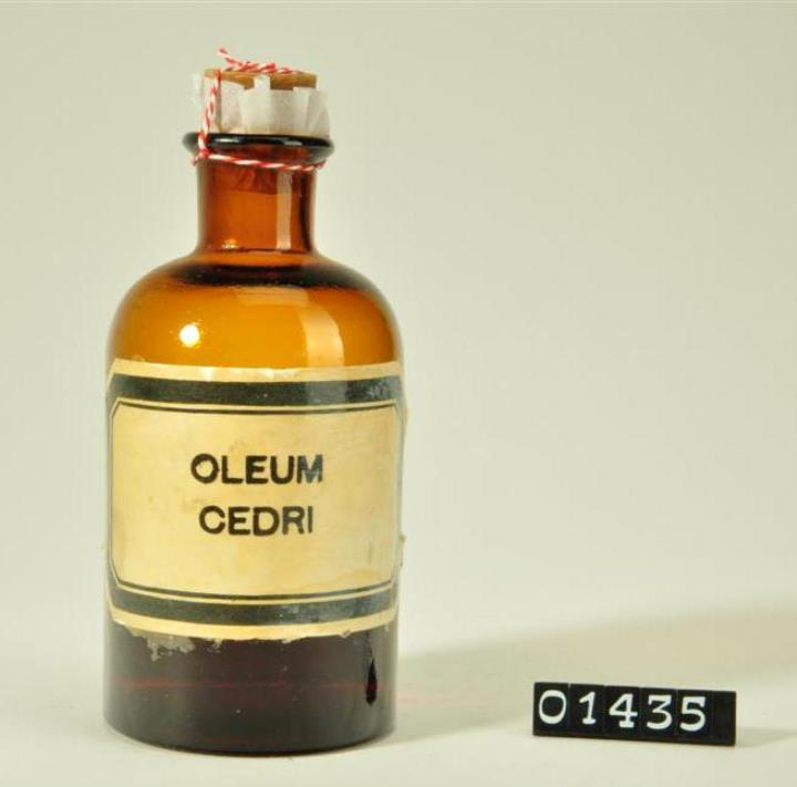 Runde, braune Enghalsflasche mit rot-weißem Rezepturfaden gesichertem Stopfen. Ausladender Mündungsrand. Mit Signierapparat bedrucktes und mit Etikettenlack überzogenes Papierschild, achteckig, mit schwarzem Doppelrand und schwarzer Schrift auf ehemals weißem Grund.