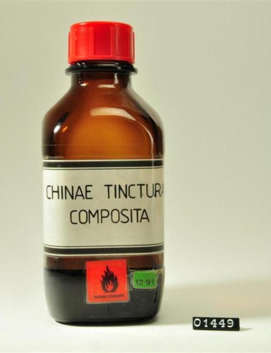 Braune Vierkantflasche mit Weithals und rotem Schraubverschluss. Mit Schablone beschriftetes und mit Klarsichtfolie überzogenes Papierschild, achteckig, mit schwarzem Doppelrand und schwarzer Schrift auf ehemals weißem Grund. Darunter rotes Warnschild mit schwarz aufgedrucktem Flammensymbol. Im Dezember 1991 aus dem Sortiment genommen (grünes Schild).